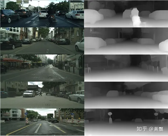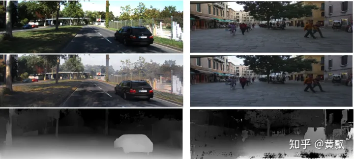 上面给的例子是KITTI数据集中的一组例子,不过深度图可能看的不是很明显,我重新将深度图涂色之后:由于深度数据的获取难度较高,所以目前有大量算法都是基于无监督模型的。即仅仅使用两个摄像机采集的双目图像数据进行联合训练。其中双目数据可彼此预测对方,从而获得相应的视差数据,再根据视差与深度的关系进行演化。亦或是将双目图像中各个像素点的对应问题看作是立体匹配问题进行训练。左视图-右视图示例:视差,以我们人眼为例,两只眼睛看到的图像分别位于不同的坐标系。将手指从较远地方慢慢移动到眼前,会发现,手指在左眼的坐标系中越来越靠右,而在右眼坐标系中越来越靠左,这种差异性就是视差。与此同时,可以说明,视差与深度成反比。除此之外,由于摄像机参数也比较容易获取,所以也可以以相机位姿作为标签进行训练。- Structure from motion/基于视频的深度估计