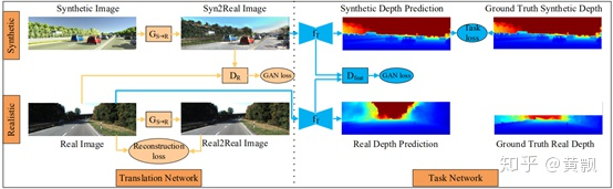 实质上,深度图像也是一种图像风格,如果我们要将生成学习引入深度估计的话,就需要注意两个地方,一个是原始图像到深度图像的风格转变,这一点可以获取类似于分割的map,另一点就是对像素点的深度进行回归。这里的方式与第一节讲的深度回归模型不一样,因为第一步的风格转变,已经对于场景和相机位姿有了很好的适应性。ECCV2018中《T2Net: Synthetic-to-Realistic Translation for Solving Single-Image Depth Estimation Tasks》所提出的T2Net尝试性地将图像风格迁移引入单目深度估计领域,虽然效果只是2016年的水平,不过也算是一次很好的尝试了。下面介绍下T2Net的思路,首先给出其网络框架:框架很明显,对于室外场景,其训练集用到了KITTI和VKITTI中的sunset场景,对于室内场景,则使用了NYU Depth v2和SUNCG,没仔细看怎么下载,相关工具在https://github.com/shurans/SUNCGtoolbox。从图中可以看到,作者做了两个模块,一个是图像风格迁移模块,一个是单目深度估计模块。其中图像风格迁移模块中包含有合成图像到真实图像的迁移,真实图像到真实图像的迁移,二者共用一个GAN。其中的Loss包含有:- 由合成图像风格迁移生成的图像与原始图像的GAN Loss,即利用判别器进行判定的误差;