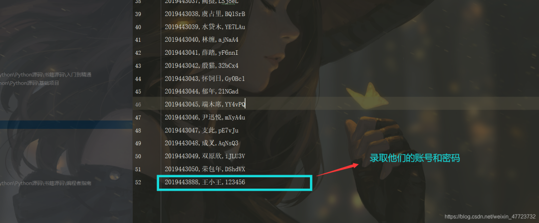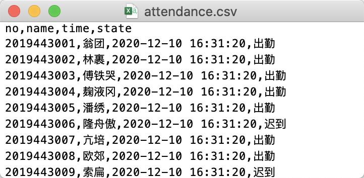 defadd(user_no): for x in student_infos: if user_no==x['no']: name=x['name'] break times=time.strftime("%Y-%m-%d %H:%M:%S", time.localtime()) choices=['出勤','迟到','请假','缺勤'] a=int(input("\t该学生出勤情况:1-出勤\t2-迟到\t3-请假\t4-缺勤:")) if a==1: data=choices[0] elif a==2: data=choices[1] elif a==3: data=choices[2] else: data=choices[3] with open(r"attendance.csv",'a+',newline='', encoding='utf-8') as f: wf = csv.writer(f) wf.writerow([user_no,name,times,data])#写入一行数据 print("{}同学{}数据已经写入成功!操作时间是{}".format(name,data,times))
