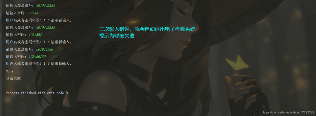 retry_time = 0 while retry_time 3: user_no = input('请输入登录账号:') password = input('请输入密码:') for i in student_infos: if i['no']==user_no and i['password']==password: returnTrue,user_no print('用户名或者密码错误!!!请重新输入。') retry_time += 1 else: returnFalse, None