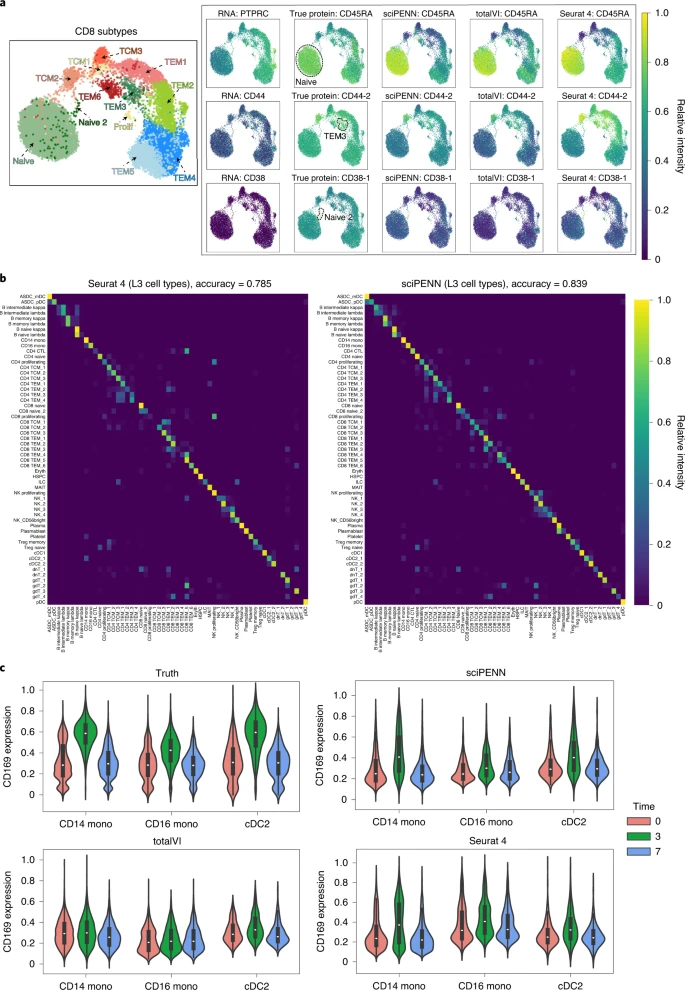 接下来,研究团队随机地将完整的PBMC数据分为训练一半和测试一半,选择了CD8亚型的三种蛋白质标志物(CD45RA,CD44-2和CD38-1)并检测了sciPENN恢复标记蛋白趋势的能力(图4)。CD45RA是CD8幼稚型的明显标记,CD44-2是CD8 TEM3和CD8 TCM2的明显标记,CD38-1是CD8 TCM2的明显标记。结果显示,sciPENN的蛋白质预测准确地恢复了这些趋势,研究人员可仅使用sciPENN预测来检测蛋白质的高表达细胞亚型。TotalVI和Seurat 4的表现比sciPENN略差,Seurat 4低估了CD8 TEM3中CD44-2的表达,TotalVI低估了CD8 NAIVE 2中CD38-1的表达。