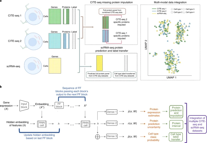 近日,美国宾夕法尼亚大学研究团队在Nature Machine Intelligence上发表了题为“A multi-use deep learning method for CITE-seq and single-cell RNA-seq data integration with cell surface protein prediction and imputation”的文章。研究团队开发了一种多用途的深度学习方法——sciPENN,支持CITE-seq和scRNA-seq数据整合,能够预测、插补scRNA-seq、CITE-seq蛋白质表达,量化不确定性以及实现从CITE-seq到scRNA-seq的细胞类型标记转移。跨多个数据集的综合评估表明,sciPENN优于当前同类其他方法。