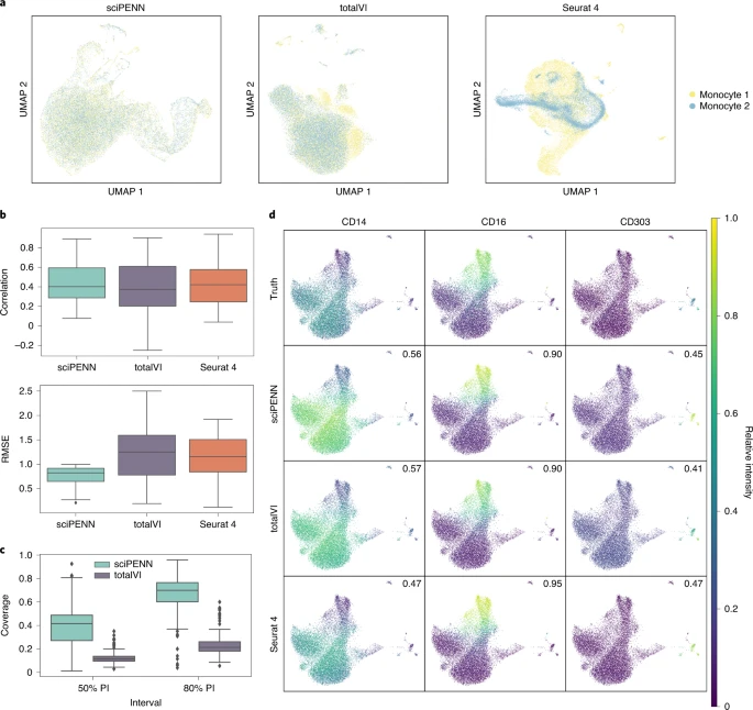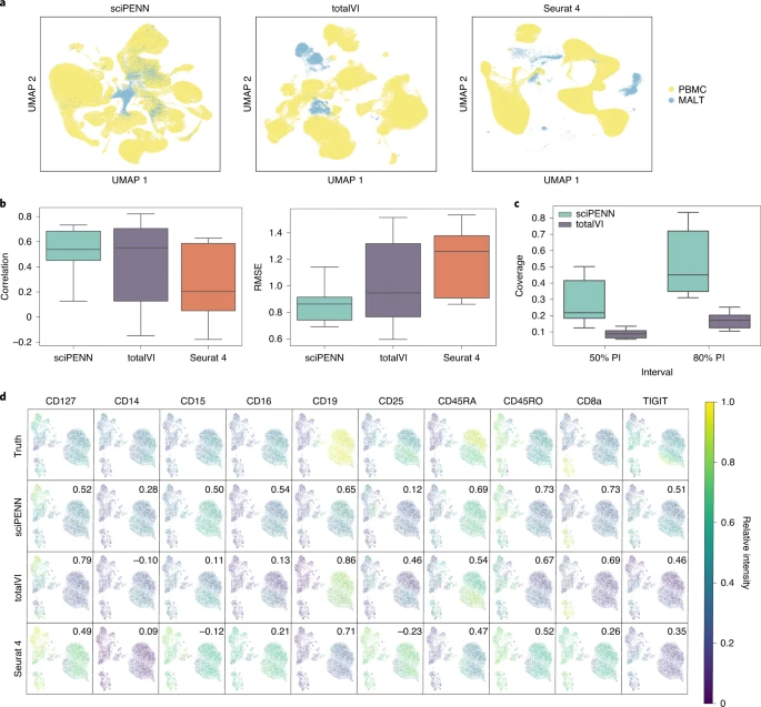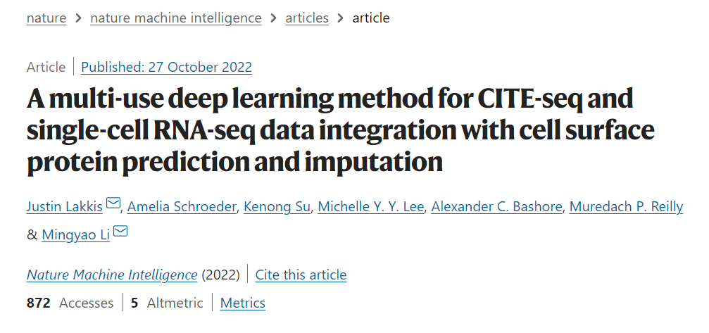 图5. 使用Seurat 4 PBMC数据集作为参考的H1N1数据集中的蛋白质表达预测。综上所述,研究团队开发了sciPENN深度学习模型,可以预测和估算蛋白质表达,集成多个CITE-seq数据集,量化预测和估算不确定性。sciPENN能够从具有部分不重叠蛋白质panel的多个CITE-seq数据集中学习,估算每个组成CITE-seq数据集的缺失蛋白质,甚至在从部分重叠的CITE-seq数据集学习后预测外部scRNA-seq数据集中的蛋白质表达。此外,sciPENN提供了比totalVI和Seurat 4更可靠、准确的结果,同时还具有高度的可扩展性和计算效率,是综合CITE-seq和scRNA-seq数据分析的一个理想工具选择。Lakkis, J., Schroeder, A., Su, K. et al. A multi-use deep learning method for CITE-seq and single-cell RNA-seq data integration with cell surface protein prediction and imputation. Nat Mach Intell (2022). https://doi.org/10.1038/s42256-022-00545-w
