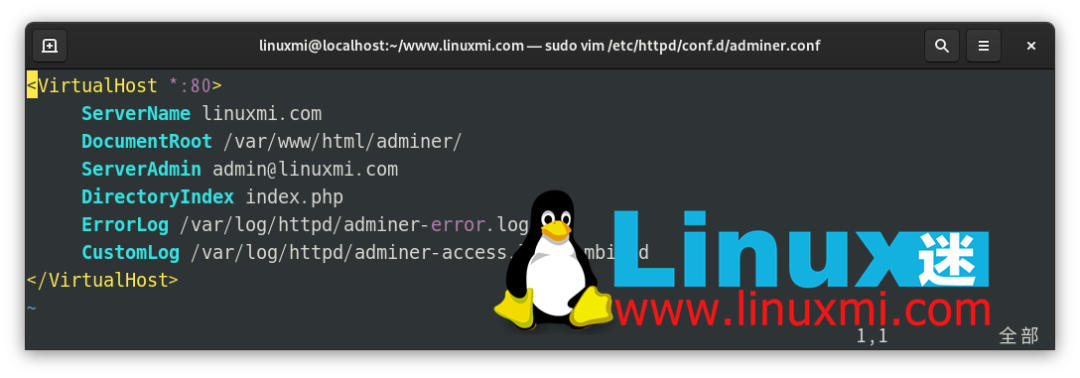 继续,您需要为Adminer 配置一个 Apache 虚拟主机文件。因此,在 /etc/httpd/conf.d/directory 中创建一个虚拟主机文件。[linuxmi@localhost www.linuxmi.com]$ sudo vim /etc/httpd/conf.d/adminer.conf