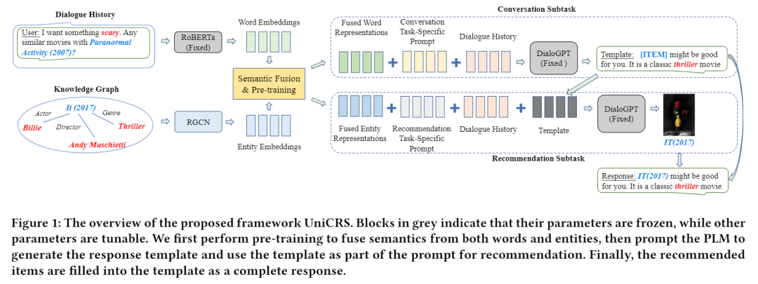 据本文所知,这是第一次以通用提示学习的方式开发统一的 CRS。 本文的方法将 CRS 的子任务制定为统一的提示学习形式,并设计具有相应优化方法的特定任务提示。 对两个公共 CRS 数据集的广泛实验证明了本文的方法在推荐和对话任务中的有效性。 方法介绍 本文提出了一种统一的 CRS 方法,即基于 PLM 的知识增强型即时学习,即 UniCRS。本文首先概述了所提出的方法,然后讨论了如何融合来自单词和实体的语义作为提示的一部分,最后介绍了 CRS 任务的知识增强提示方法。本文提出的模型的整体架构如图 1 所示。