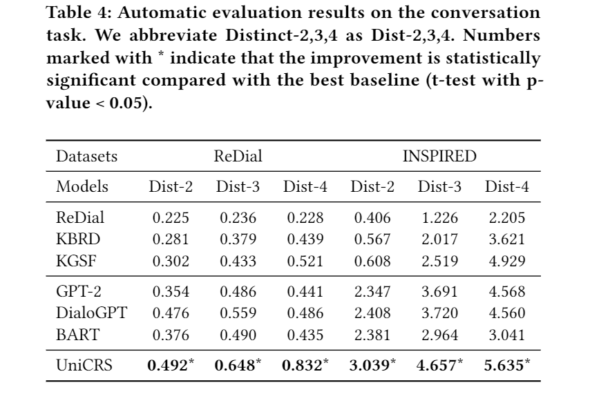 表 3 显示了不同方法在推荐任务上的性能。对于这三种 CRS 方法,所有数据集的性能顺序是一致的,即 KGSF > KBRD > ReDial。KGSF 和 KBRD 都将外部 KG 纳入其推荐模块中,这可以丰富对话历史中提到的实体的语义,以更好地捕捉用户意图和偏好。此外,KGSF 还采用互信息最大化的方法来进一步改进实体表示。对于四个预训练模型,本文可以看到 BERT 和 BART 的表现优于 GPT-2 和 DialoGPT。原因可能是 GPT-2 和 DialoGPT 基于单向 Transformer 架构,这限制了它们的对话理解能力。此外,可以看到 BART 在 ReDial 数据集上实现了相当的性能,甚至优于 BERT。这表明 BART 也可以很好地理解推荐任务的对话语义。最后,可以看到本文模型大大优于所有基线。本文利用专门设计的提示来指导基础 PLM,并结合 KG 通过预训练任务提高提示质量。