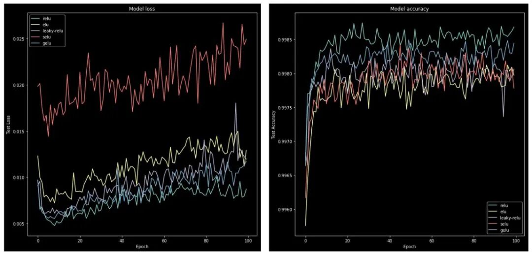 基于此,我们可以为每个激活函数绘制从 model.fit() 得到的历史图,然后看看损失和准确度结果的变化情况。现在我们可以为数据绘图了,我用 matplotlib 写了一小段代码:new_act_arr = act_func[1:]
