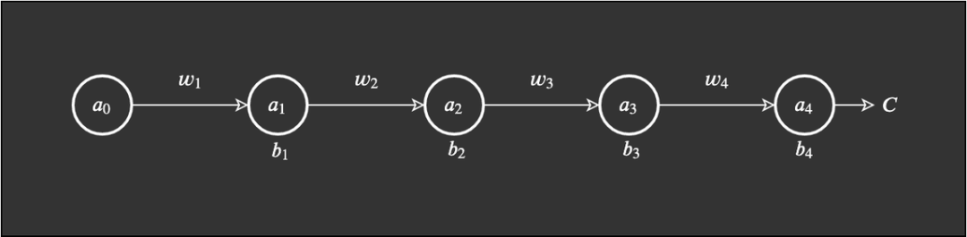 注意,这个示例也可用于展示梯度消失问题,而我是从更概念的角度选择了它,以便更轻松地解释。本质上讲,当 01 时,我们可能遇到梯度爆炸问题。但是,当一个层遇到这个问题时,必然有更多权重满足梯度消失或爆炸的条件。我们从一个简单网络开始。这个网络有少量权重、偏置和激活,而且每一层也只有一个节点。