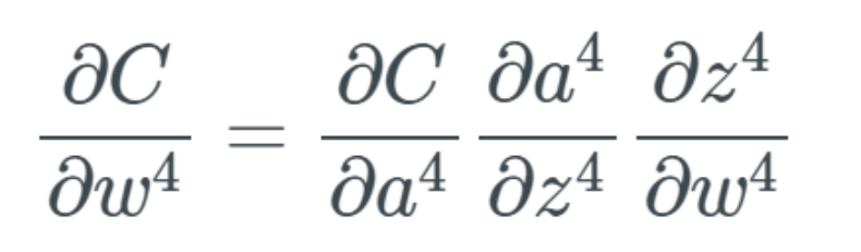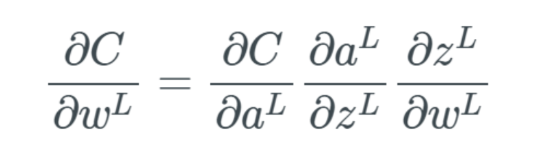 sigmoid 这样的函数常被称为非线性函数,因为我们不能用线性的项来描述它。很多激活函数都是非线性或者线性和非线性的组合(有可能函数的一部分是线性的,但这种情况很少见)。这基本上没什么问题,但值恰好为 0 或 1 的时候除外(有时候确实会发生这种情况)。为什么这会有问题?这个问题与反向传播有关(有关反向传播的介绍请参阅我的前一篇文章)。在反向传播中,我们要计算每个权重的梯度,即针对每个权重的小更新。这样做的目的是优化整个网络中激活值的输出,使其能在输出层得到更好的结果,进而实现对成本函数的优化。在反向传播过程中,我们必须计算每个权重影响成本函数(cost function)的比例,具体做法是计算成本函数相对于每个权重的偏导数。假设我们不定义单个的权重,而是将最后一层 L 中的所有权重 w 定义为 w^L,则它们的导数为: