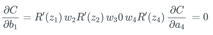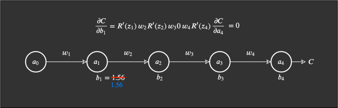 反过来,当我们得到 R'(z_3)=0 时,与其它值相乘自然也只能得到 0,这会导致这个偏置死亡。我们知道一个偏置的新值是该偏置减去学习率减去梯度,这意味着我们得到的更新为 0。