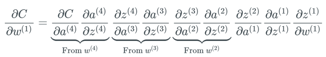 出自 Nielsen 的书《Neural Networks and Deep Learning》。在这个示例中,隐藏层 4 的学习速度最快,因为其成本函数仅取决于连接到隐藏层 4 的权重变化。我们看看隐藏层 1;这里的成本函数取决于连接隐藏层 1 与隐藏层 2、3、4 的权重变化。如果你看过了我前一篇文章中关于反向传播的内容,那么你可能知道网络中更前面的层会复用后面层的计算。
