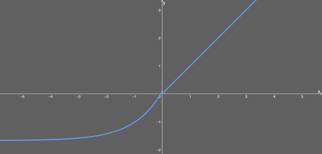 看起来很简单。如果输入 x 大于 0,则 y 值输出为 1;如果输入 x 小于或等于 0,则输出是 ELU 函数(未微分)加上 α 值。