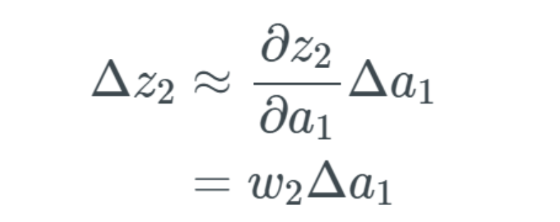 所描述的变化 Δa_1 现在会导致下一层的输入 z_2 出现变化。如果这看起来很奇怪或者你还不信服,我建议你阅读我的前一篇文章。