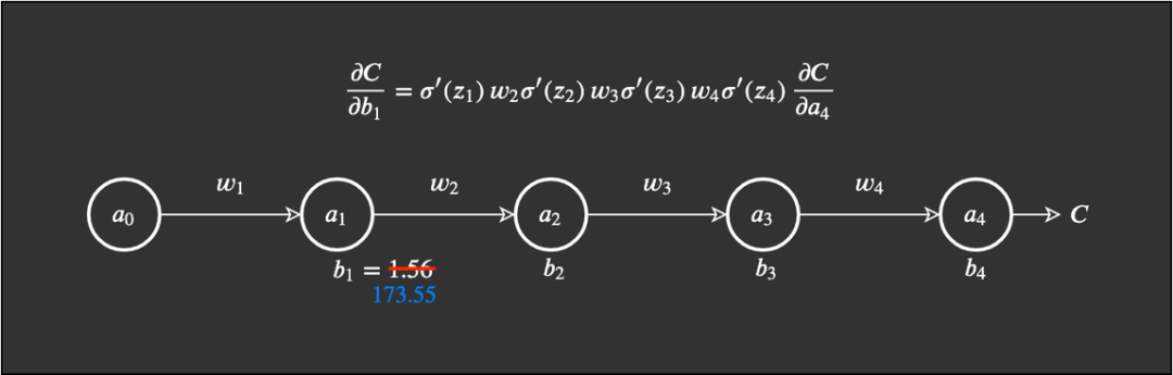 我们先从网络的起点开始,计算第一个偏置 b_1 中的变化将如何影响网络。因为我们知道,在上一篇文章中,第一个偏置 b_1 会馈入第一个激活 a_1,我们就从这里开始。我们先回顾一下这个等式: