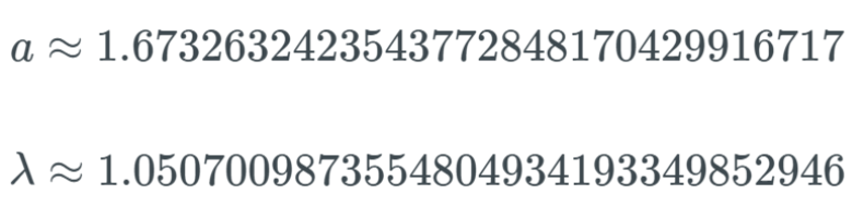 扩展型指数线性单元激活函数比较新,介绍它的论文包含长达 90 页的附录(包括定理和证明等)。当实际应用这个激活函数时,必须使用 lecun_normal 进行权重初始化。如果希望应用 dropout,则应当使用 AlphaDropout。后面的代码部分会更详细地介绍。论文作者已经计算出了公式的两个值:α 和 λ;如下所示:
