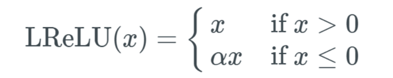第一部分线性是当 x 大于 0 时,输出为 1;而当输入小于 0 时,输出就为 α 值,这里我们选择的是 0.2。