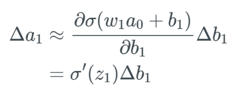 上式表示当 b_1 变化时,激活值 a_1 中存在某个变化。我们将这个变化描述为 Δa_1。我们将变化 Δa_1 看作是与激活值 a_1 中的变化加上变化 Δb_1 近似一样。
