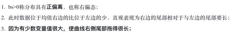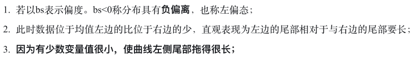 偏度(skewness) :也称为偏态,是统计数据分布偏斜方向和程度的度量,是统计数据分布非对称程度的数字特征。直观看来就是密度函数曲线尾部的相对长度。偏度刻画的是分布函数(数据)的对称性。关于均值对称的数据其偏度系数为0,右侧更分散的数据偏度系数为正,左侧更分散的数据偏度系数为负。样本偏度系数如下: