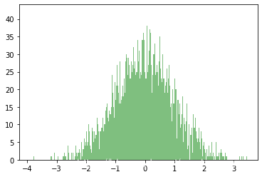 data = list (np.random.randn(10000 )) plt.hist(data, 1000 , facecolor='g' , alpha=0.5 ) plt.show() s = pd.Series(data) print ('偏度系数' ,s.skew()) print ('峰度系数' ,s.kurt()) 结果如下: