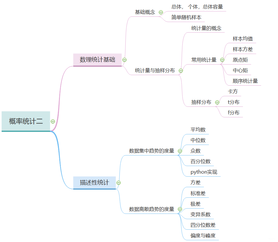 数理统计是从抽样统计的角度去估计样本的总体分布或未知的规律, 首先介绍了数理统计里面的基本概念, 例如总体,个体, 样本等, 然后是统计量与抽样分布, 介绍了常用的统计量像均值, 方差, 标准差,中心距,原点矩等。然后介绍了三个非常重要的抽样分布卡方, T和F。最后是描述性统计这块,介绍了数据集中趋势度量, 这里面包括平均数,中位数, 众数, 频数,百分位数等并给出了numpy实现, 然后是离散趋势度量, 方差, 标准差, 极差,四分位点的内容, 然后是峰度和偏度的介绍。