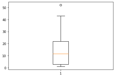 pd .Series (a ).describe ()## 结果: count 16.000000 mean 14.750000 std 15.316658 min 1.000000 25% 2.750000 50% 11.500000 75% 22.000000 max 52.000000 dtype : float64 ## 还可以借助plt 画出箱型图 import matplotlib .pyplot as plt plt .boxplot (pd .Series (a ))