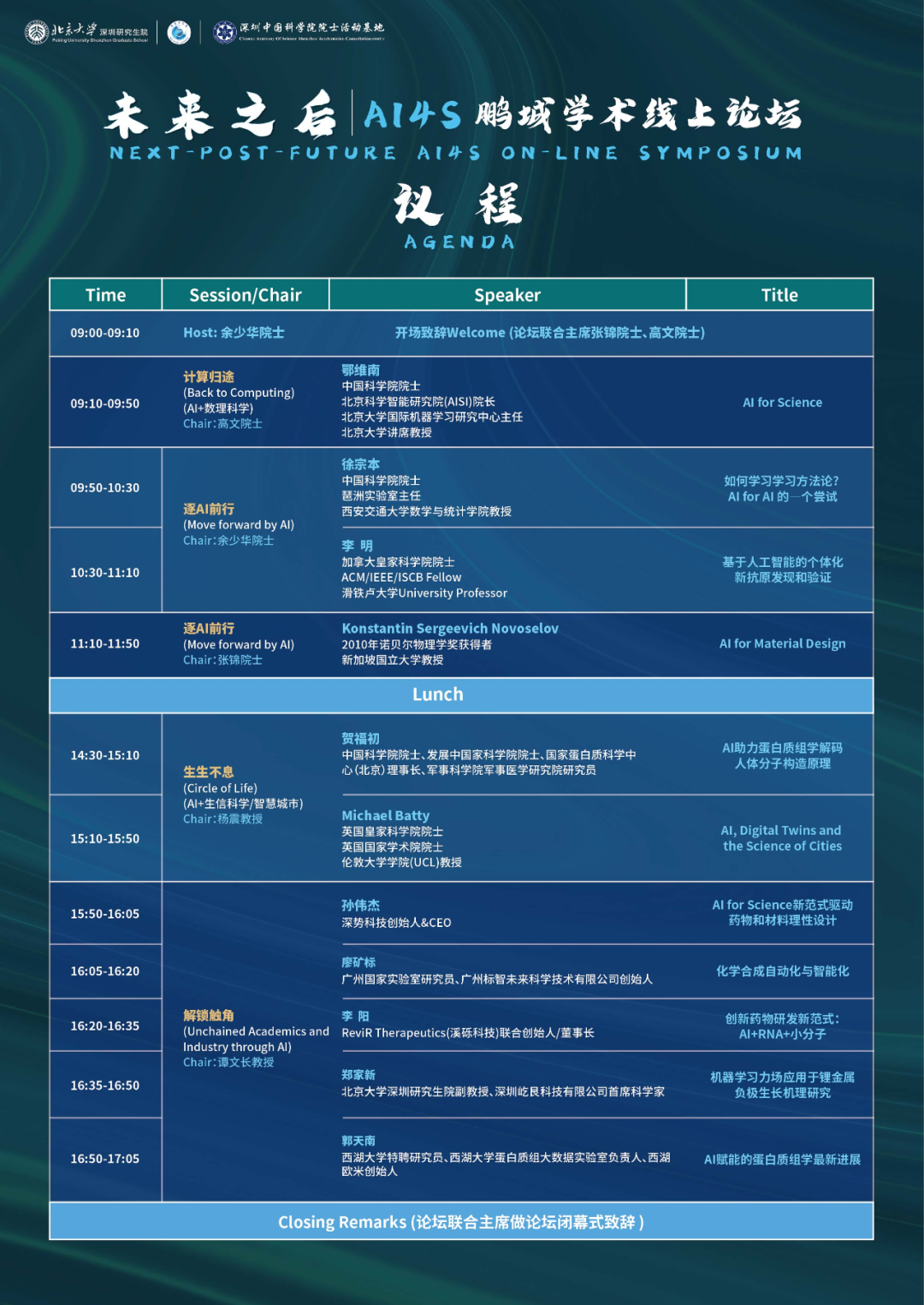 站在这个科技革命的时代转角,为全面、深刻地剖析 AI for Science 未来发展趋势,首期“未来之后”AI4S鹏城学术线上论坛(Next-Post-Future AI4S Pengcheng On-Line Symposium)将于12月4日以线上形式举办。