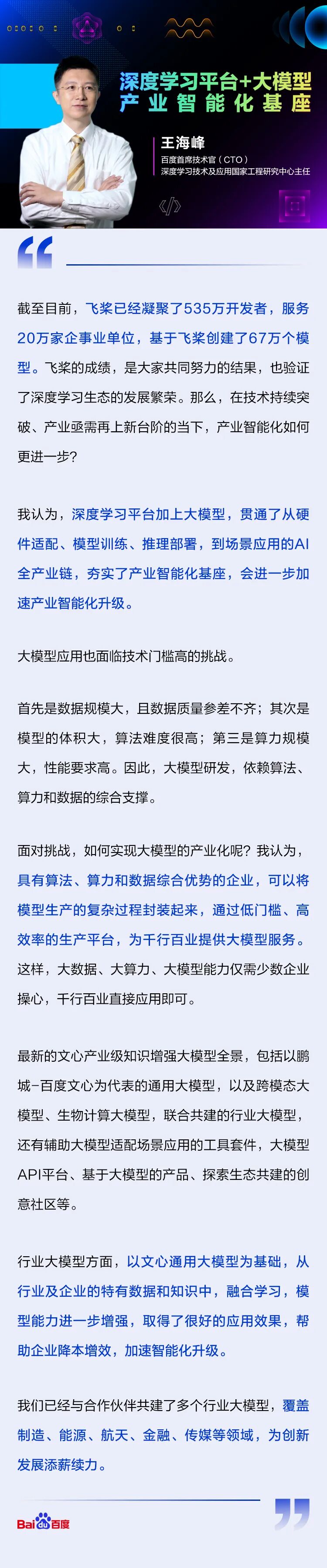 我认为,深度学习平台加上大模型,贯通了从硬件适配、模型训练、推理部署,到场景应用的AI全产业链,夯实了产业智能化基座,会进一步加速产业智能化升级。