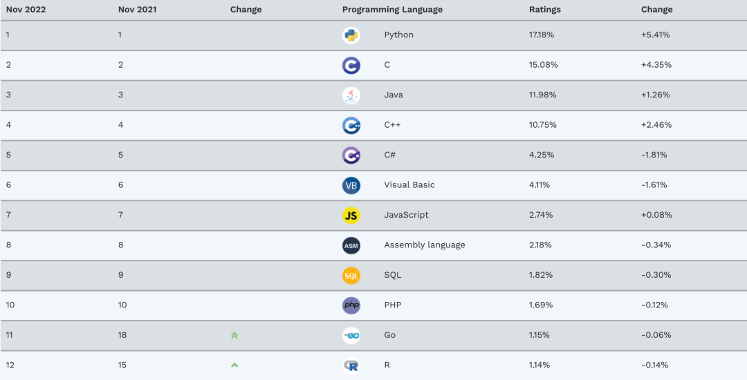 根据TIOBE 2022年11月的最新排行榜,我们可以看到在编程语言热度排名方面,Python位居第一。对比去年的数据,Python的热度不减。