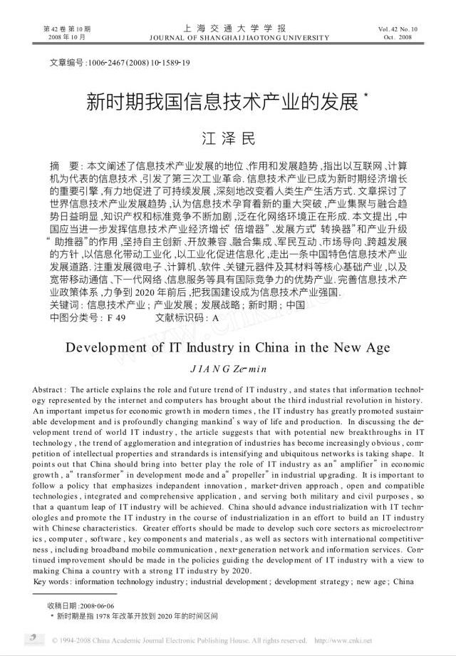 2008年10月,江泽民在上海交通大学学报发表了一篇题为《新时期我国信息技术产业的发展》的论文。