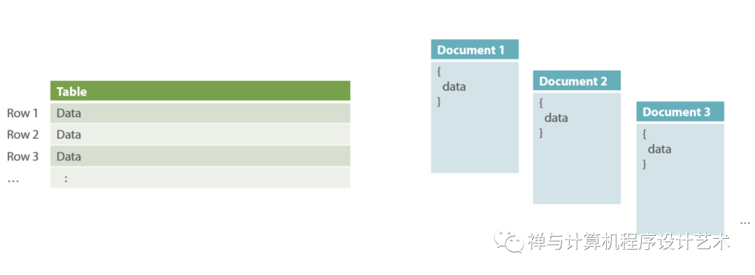 In this diagram on your left you can see we have rows and columns, and in the right, we have a document database which has a similar structure to JSON. Now for the relational database, you have to know what columns you have and so on. However, for a document database, you have data store like JSON object. You do not require to define which make it flexible.