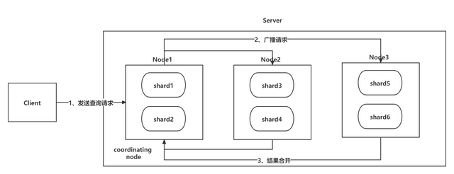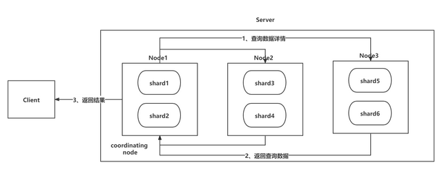 第一步:Client 发送查询请求到 Server 端,Node1 接收到请求然后创建一个大小为 from + size 的优先级队列用来存放结果,此时 Node1 被称为 coordinating node(协调节点); 第二步:Node1 将请求广播到涉及的 shard 上,每个 shard 内部执行搜索请求,然后将执行结果存到自己内部的大小同样为 from+size 的优先级队列里; 第三步:每个 shard 将暂存的自身优先级队列里的结果返给 Node1,Node1 拿到所有 shard 返回的结果后,对结果进行一次合并,产生一个全局的优先级队列,存在 Node1 的优先级队列中。(如上图中,Node1 会拿到 (from + size) * 6 条数据,这些数据只包含 doc 的唯一标识_id 和用于排序的_score,然后 Node1 会对这些数据合并排序,选择前 from + size 条数据存到优先级队列); 2.2 Fetch 阶段