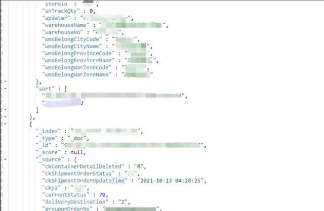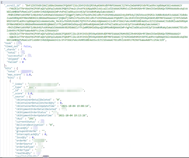 GET /wms_order_sku2021_10/_search { "query" : { "bool" : { "must" : [ { "range" : { "shipmentOrderCreateTime" : { "gte" : "2021-10-12 00:00:00" , "lt" : "2021-10-15 00:00:00" } } } ] } }, "size" : 20 , "sort" : [ { "_id" : { "order" : "desc" } },{ "shipmentOrderCreateTime" :{ "order" : "desc" } } ], "search_after" : ["SO-460_152-1447931043809128448-100017918838" ,1634077436000 ] }