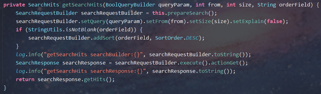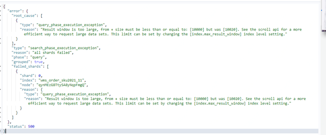private SearchHits getSearchHits (BoolQueryBuilder queryParam, int from , int size, String orderField ) { SearchRequestBuilder searchRequestBuilder = this .prepareSearch(); searchRequestBuilder.setQuery(queryParam).setFrom(from ).setSize(size).setExplain(false ); if (StringUtils.isNotBlank(orderField)) { searchRequestBuilder.addSort(orderField, SortOrder.DESC); } log.info("getSearchHits searchBuilder:{}" , searchRequestBuilder.toString()); SearchResponse searchResponse = searchRequestBuilder.execute().actionGet(); log.info("getSearchHits searchResponse:{}" , searchResponse.toString()); return searchResponse.getHits(); } 2.5 小结 其实 ES 对结果窗口的返回数据有默认 10000 条的限制(参数:index.max_result_window = 10000),当 from + size 的条数大于 10000 条时 ES 提示可以通过 scroll 方式进行分页,非常不建议调大结果窗口参数值。