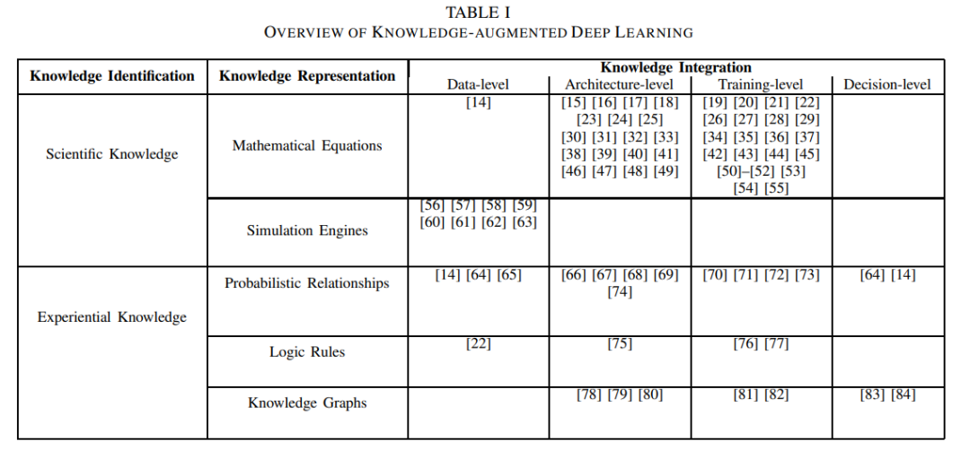 我们组织这次综述如下。在第二节中,我们首先介绍了KADL的概念,并定义了三个基本任务(即知识识别、知识表示和知识集成)。然后我们回顾了KADL方法,其中我们根据它们的重点领域知识对不同的技术进行了分类:1)第三节中的带有科学知识的深度学习,2)第四节中的带有经验知识的深度学习。在每个类别中,我们确定了领域知识、它的表示格式,以及为知识与数据的集成提出的现有方法。表一概述了现有的知识增强深度学习方法。