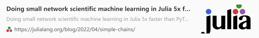 2022 年 4 月,SciML 团队在 Julia 博客上发表了一篇关于在 Julia 中使用小型网络进行科学机器学习的文章。他们将其性能与 PyTorch 的等效性能进行了比较,并在此基础上获得了 5 倍的速度提高。虽然 PyTorch 通常是同类中最好的工具,但该文章强调,当您想将科学计算结合到您的深度学习(DL)工作流程中时,Julia 在深度学习(DL)领域确实具有较好的效果。你可以在这里阅读全文: