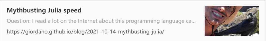 如果想了解 Julia 的真实速度性能,Mosè有一个不错的帖子,它对 Julia 的速度神话提出了挑战,我强烈建议你去看看: