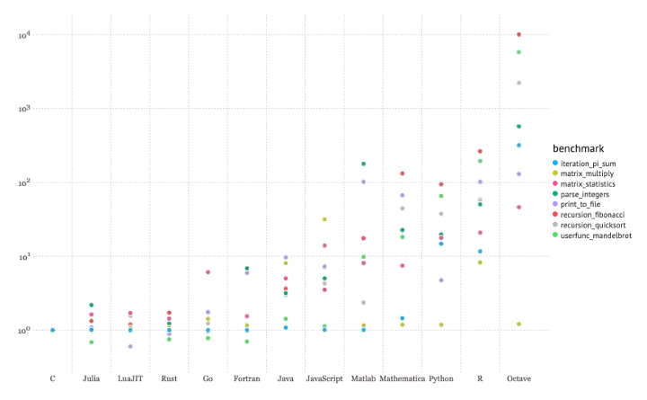 虽然关于 Julia 的性能有很多夸大和错误引导的文章,但使用 Julia,比起 Python 和 Matlab 等语言,在多数情况下我们还是能获得比较大的性能提升。