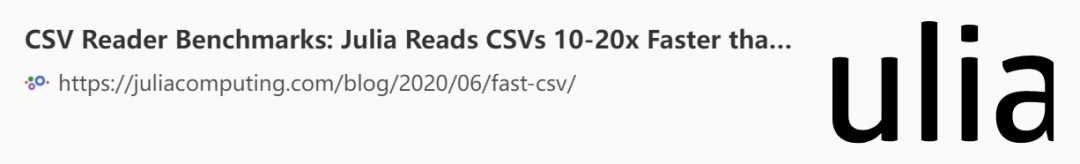 Julia 提高速度性能的另一个地方是读取 CSV(大多数数据科学家应该都不愿意承认他们要频繁做这个操作)。下面这篇文章写的非常好,它描述了 Julia 和 CSV.jl 是如何做到比 Python 和 R 快 10-20 倍的。