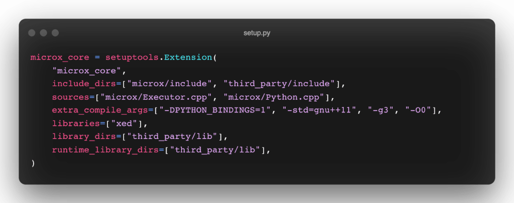 例如,以下是如何使用 setuptools 定义 microx 的本机扩展(microx_core):