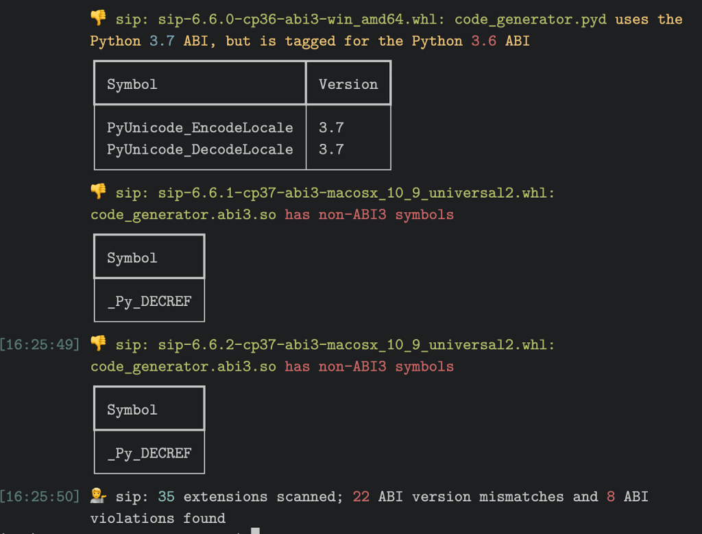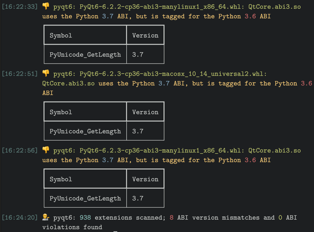 总共有 1139 个(约 3%)Python 扩展存在版本冲突,90 个(约 0.02%)存在完全的 ABI 冲突。这说明了两件事:同一个包在多个轮子和扩展中往往会违反 ABI,而同一轮子中的多个扩展往往会同时违反 ABI。PyQt6 和 sip 都是 Qt 项目的一部分,并且都存在 ABI 版本冲突:多个轮子被标记为 CPython 3.6(cp36-abi3),但 API 仅在 CPython 3.7 中稳定。