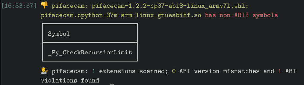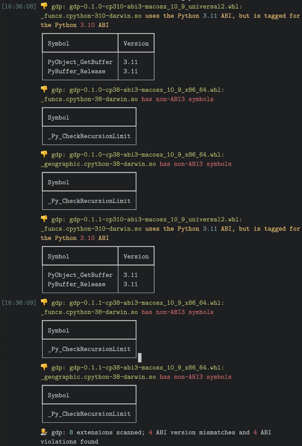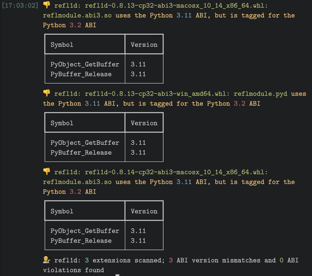 这一切看起来都很糟糕,但这只是一个抽象的问题:也有可能每个 Python 打包者都正确地构建了轮子,并且没有发布任何错误标记(或完全无效)的 abi3 样式轮子。为了了解事情到底有多糟糕,开发了一个审计系统。Abi3audit 的存在的理由是发现这些类型的 ABI 违规错误:它扫描单个扩展、Python 轮子(可以包含多个扩展)和整个包历史记录,报告任何与所指定的稳定 ABI 版本不匹配或与稳定 ABI 完全不兼容的内容。为了获得一个可审计包的列表,将其输入到 abi3audit 中,使用 PyPI 的公共 BigQuery 数据集生成了过去 21 天内从 PyPI 下载的每个包含 abi3 轮子的包的列表:(此处选择了 21,因为在测试时突破了 BigQuery 配额。尽管预计回报会逐渐减少,看到一年内的完整下载列表或 PyPI 的整个历史会很有趣。)从这个查询中,得到了 357 个包,这些包是作为 GitHub Gist 上传的。保存了这些包后,只需一次调用即可获得来自 abi3audit 的 JSON 报告:该审计的 JSON 也可以作为 GitHub Gist 提供。• 在从 PyPI 查询的 357 个初始包中,有339 个实际审计的轮子。有些是 404s(可能是一开始创建然后删除的),而另一些是用 abi3 标记的,但实际上不包含任何 CPython 扩展模块(从技术上讲,这确实使它们与 abi3 兼容!)。其中有几个是 ctypes 风格的模块,要么有一个供应商提供的库,要么有加载主机预期所包含库的代码。• 剩下的 339 个包裹之间总共有 13650 个贴有标签的轮子。最大的(以轮子计)是 eclipse-zenoh-nightly,有 1596 个轮子(占 PyPI 上所有 abi3 标记轮子的近 12%)。• 13650 个 abi3 标记的轮子总共有 39544 个共享对象,每个共享对象之间都有一个潜在的 Python 扩展。换句话说:平均每个 abi3 标记的轮子中有 2.9 个共享对象,每个对象都由 abi3audit 审核。• 如果试图解析每个 abi3 标记的轮子中的每个共享对象会发现各种奇怪的结果:许多轮子包含无效的共享对象:以废话开头的ELF文件(但在文件后面包含一个有效的ELF)、未清理的临时构建工件,以及少数轮子似乎包含手动修改二进制文件的编辑器样式交换文件。不幸的是,与 Moyix 不同,我们没有发现任何猫耳。在 357 个有效包中,有54 个(15%)包含违反 ABI 版本的轮子。换句话说:大约六分之一的包中有轮子声称支持特定的 Python 版本,但实际上使用的是较新 Python 版本的 ABI。更严重的是:在 357 个有效的程序包中,11 个(3.1%)包含了完全违反 ABI 的行为。换言之:大约三十分之一的包中有轮子声称与 ABI 兼容,但根本不兼容!