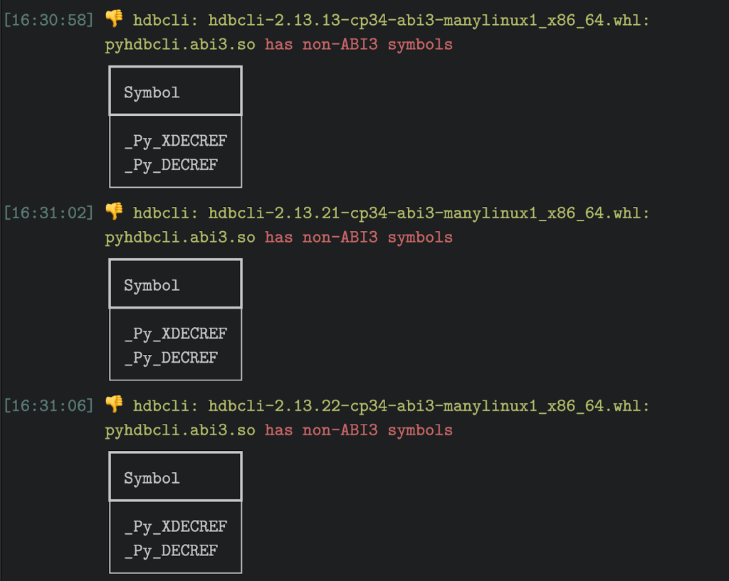 此外,sip 还有一些完全违反 ABI 的轮子,全部来自内部 _Py_DECREF API:refl1d 是 NIST 的反射软件包。NIST 发布了几个标记为 Python 3.2 的稳定 ABI(绝对最低)的版本,而实际上目标是发布 Python 3.11 的稳定 ABI (绝对最高-甚至还没有发布!)hdbcli 是 SAP HANA的专有客户端,由 SAP 自己发布。它被标记为 abi,这很酷!然而不幸的是,它实际上并不兼容 abi3:这再次表明,构建时没有正确的宏。我们可以通过源代码了解更多信息,但这个包是完全专有的。虽然这是两个较小的包,但很有趣的是,它们都存在稳定的 ABI 违规,这种违规不仅仅是引用/计数助手 API:最令人满意的是这个,因为它是用 Go 编写的 Python 扩展,而不是、C++ 或 Rust!