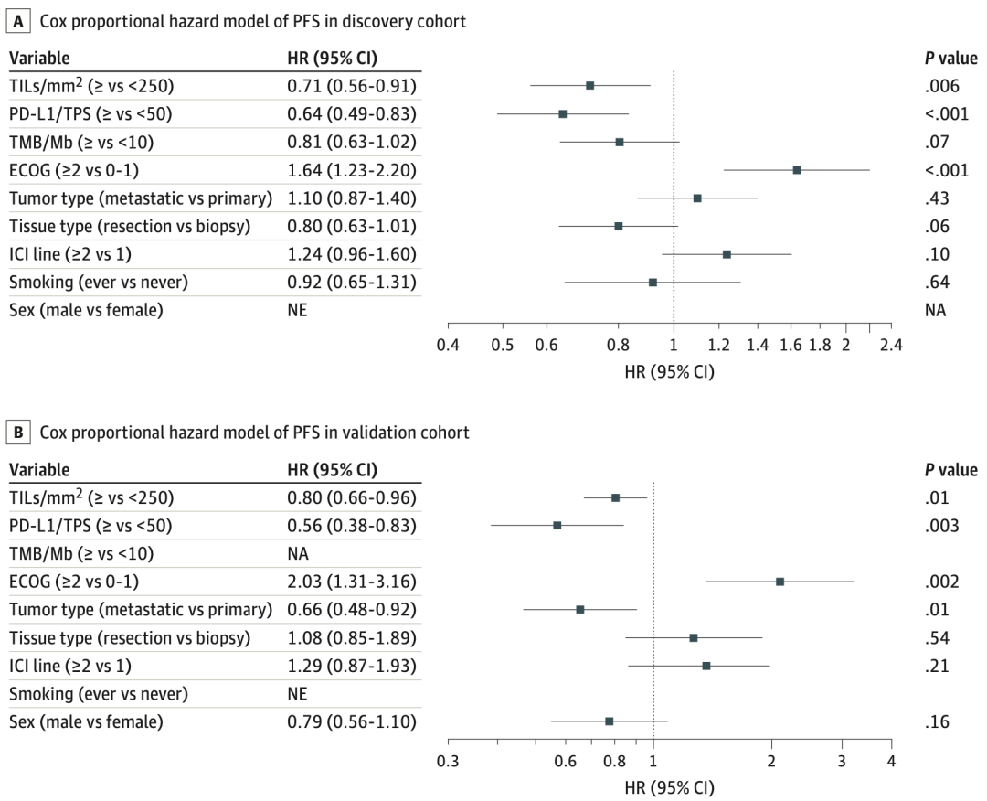 由于影响免疫治疗疗效的因素有很多,Kwiatkowski团队进行了多变量分析,确认了TILs与免疫治疗疗效独立相关。在发现队列,PFS的HR为0.71(p=0.006),OS的HR为0.74(p=0.03);在验证队列,PFS的HR为0.80(p=0.01),OS的HR的0.75(p=0.001)。