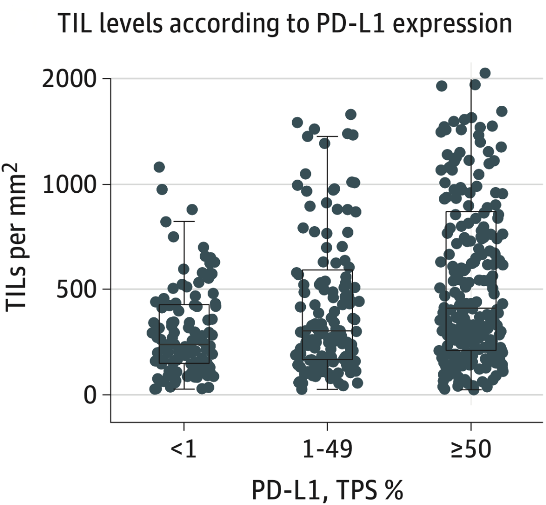 Kwiatkowski团队先探索了TILs水平与PD-L1表达水平的相关性。他们发现,二者之间存在正相关关系,在PD-L1<1%、1-49%、≥50%亚组中,TILs水平依次升高,中位值分别为238、303、410个细胞/平方毫米。值得注意的是,在这个研究中,TILs水平与TMB无关,而且TMB与PD-L1表达也无关。