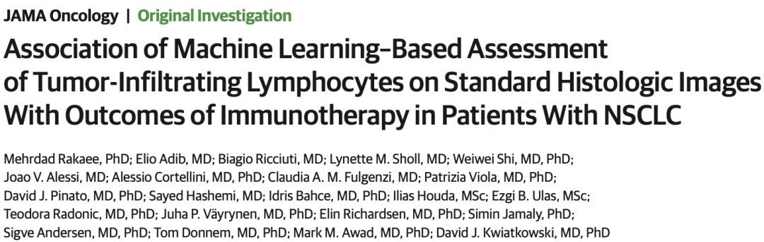 [5]. Rakaee M, Adib E, Ricciuti B, et al. Association of Machine Learning-Based Assessment of Tumor-Infiltrating Lymphocytes on Standard Histologic Images With Outcomes of Immunotherapy in Patients With NSCLC [published online ahead of print, 2022 Nov 17]. JAMA Oncol. 2022;10.1001/jamaoncol.2022.4933. doi:10.1001/jamaoncol.2022.4933