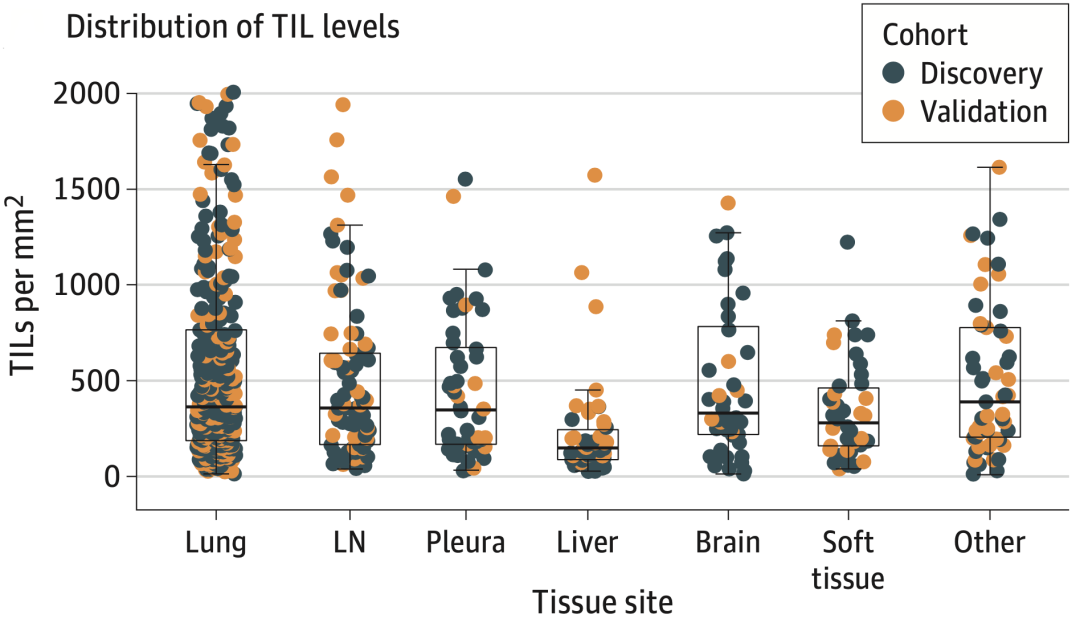总的来说,Kwiatkowski团队发现ML算法可定量计数肺原发灶和各种转移灶HE染色图像中的TILs。所有病理部位TILs密度的中位值为327(四分位164-681)个细胞/平方毫米,除肝转移灶TILs密度较低(中位值148个细胞/平方毫米)外,其他病理部位的TILs水平相似。