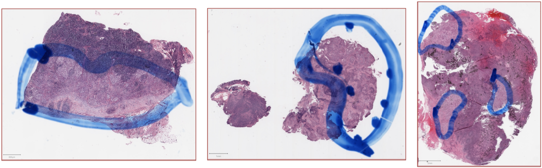 图1.三个淋巴结病理图像中进行分析的癌巢和癌巢的结缔组织基质被圈出。