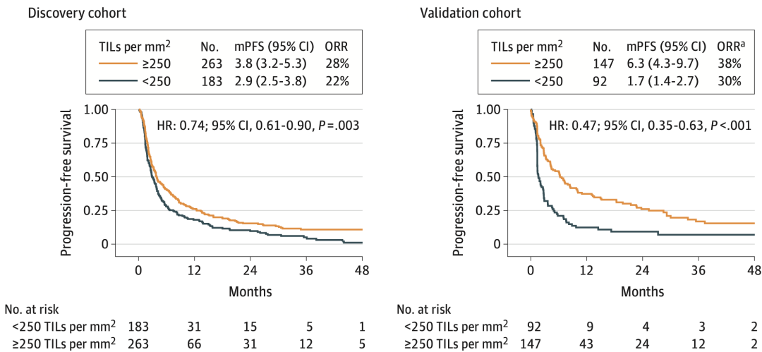 研究结果表明,基于ML的算法可以定量分析肺原发灶和各种转移灶的手术或活检常规组织病理HE染色图像中的TILs。他们还发现,高密度TILs(≥250个细胞/平方毫米)与免疫单药治疗无进展生存期(PFS)和总生存期(OS)均独立相关。具体来说,在发现队列中,高密度TILs与疾病进展风险下降29%,死亡风险下降26%相关;在验证队列中,高密度TILs与疾病进展风险下降20%,死亡风险下降25%相关。