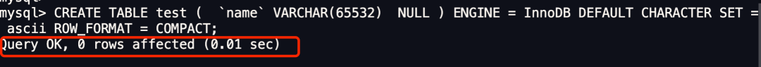 可以看到,创建成功了。说明我们的推论是正确的,在算 varchar(n) 中 n 最大值时,需要减去 「变长字段长度列表」和 「NULL 值列表」所占用的字节数的。