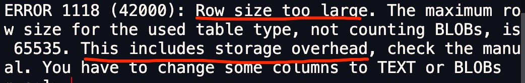 从报错信息就可以知道一行数据的最大字节数是 65535(不包含 TEXT、BLOBs 这种大对象类型),其中包含了 storage overhead。